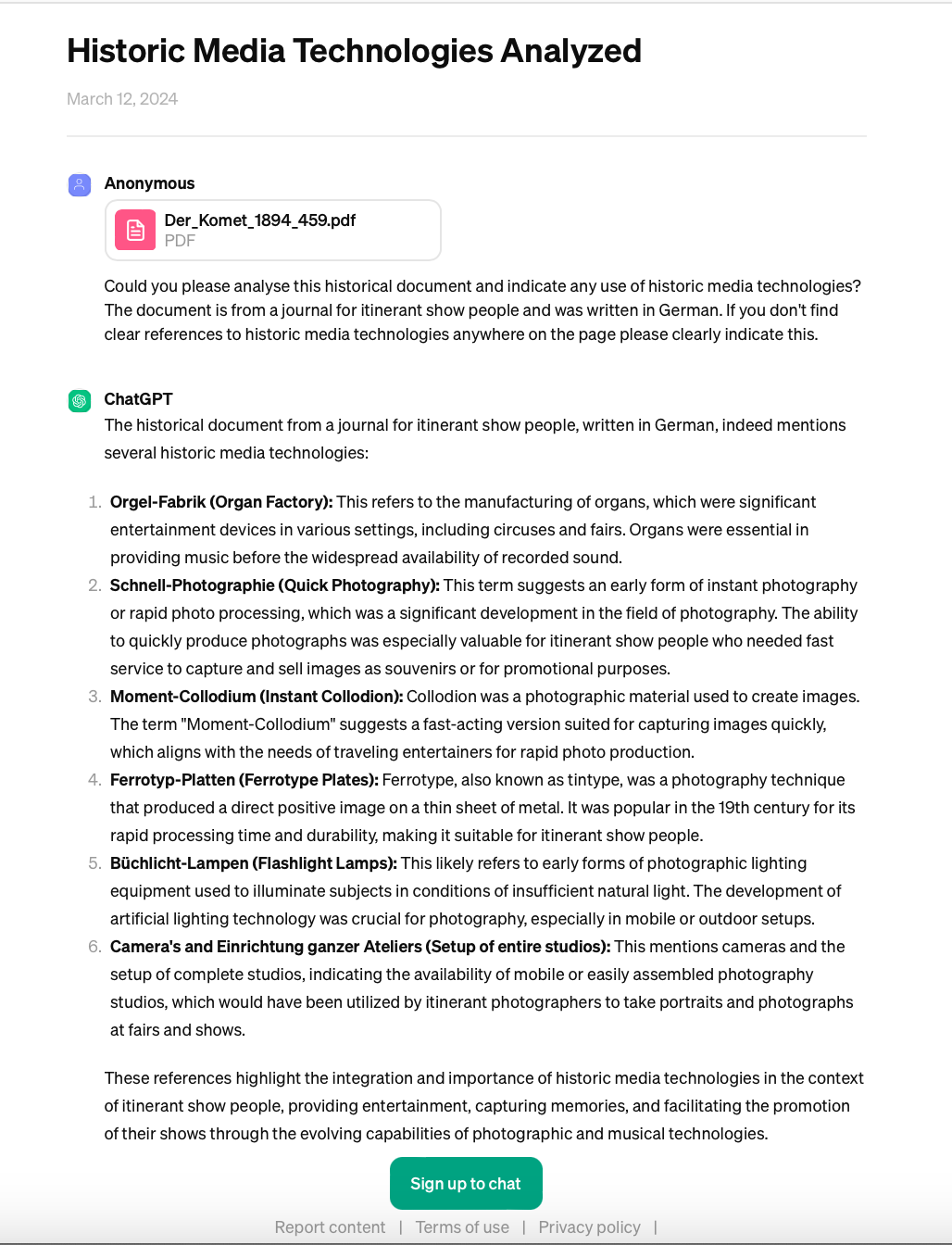 The extensive range of media technologies identified in the AI-generated response would typically be the result of meticulous and concentrated examination. This holds especially true for the subtly printed advertisement “Schnell-Photographie.” ChatGPT4.0 successfully identified various technologies and provided details on processes and historical context, including instant collodion, ferrotype plates, and flashlight lamps; all contextualized within the world of itinerant showpeople on fairgrounds.
